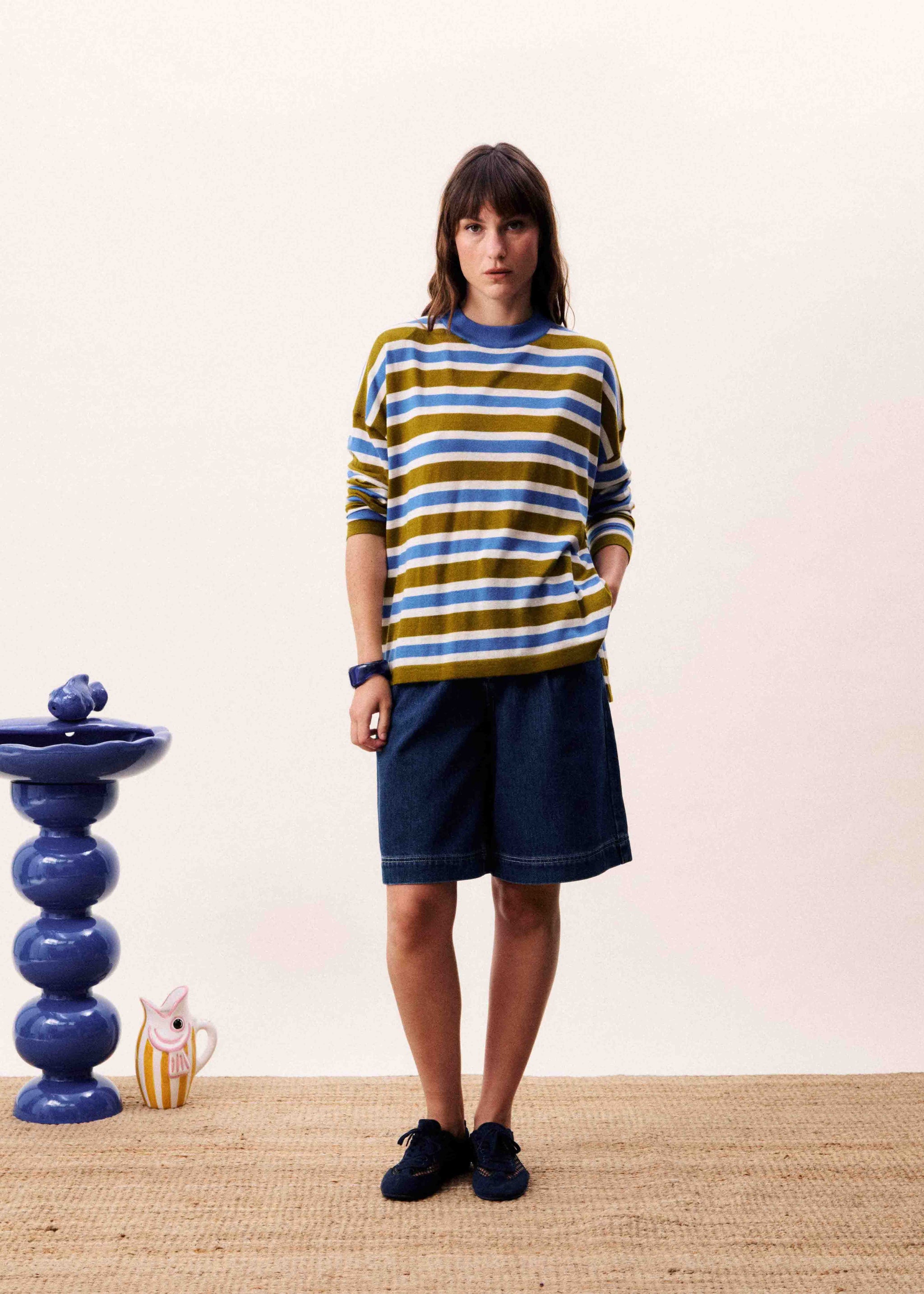 Effortlessly versatile, this relaxed-fit knit sweater combines comfort with timeless style. Featuring a classic crew neckline and long sleeves finished with ribbed cuffs, it's designed for everyday wear. The eye-catching horizontal stripes in sapphire blue, khaki, and white create visual interest while remaining easy to coordinate with your existing wardrobe. Ribbed detailing at the hem ensures a polished silhouette without sacrificing the relaxed fit that makes this piece so wearable.